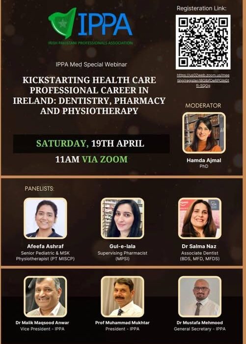 آئرش پاکستانی پروفیشنلز ایسوسی ایشن (Irish Pakistani Professionals Association – IPPA) آئرلینڈ میں مقیم پاکستانی ڈینٹسٹس ، فارماسسٹس ،اور فزیوتھراپسٹس کے لیے ایک خصوصی مفت ویبینار کا انعقاد کر رہا ہے۔